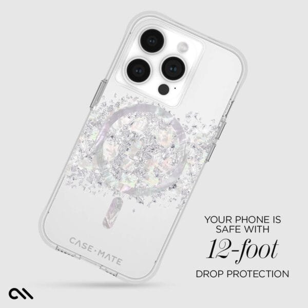 Pretty in pearls— the Touch of Pearl MagSafe Phone Case for the iP 15 Pro features genuine Mother of Pearl elements with an irresistible pearlescent design. We know how much you love your phone. so feel confident knowing it’s safe with 12-foot drop protection while strong built-in magnets allow for easy MagSafe accessorizing and charging.